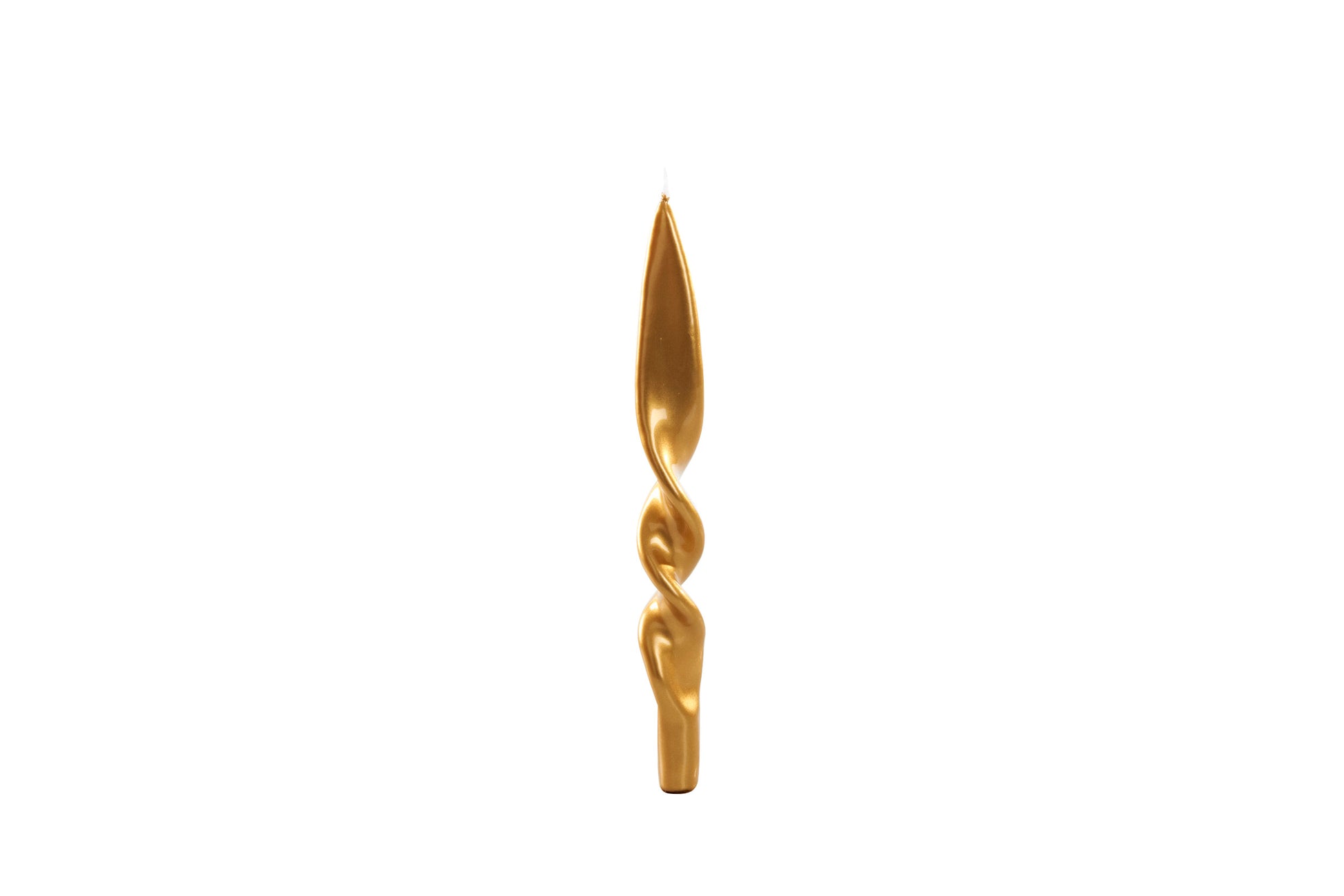 Astuccio contenente 2 candele della linea Denise, un raffinato torchon di altezza 280 mm, realizzato a mano immergendo la candela in acqua tiepida per renderla malleabile alla mano esperta dell'artigiano La finitura SHEFFIELD, declinata nelle versioni oro, argento e rame, conferisce al colore metallico un calore davvero inatteso, ed è subito festa!